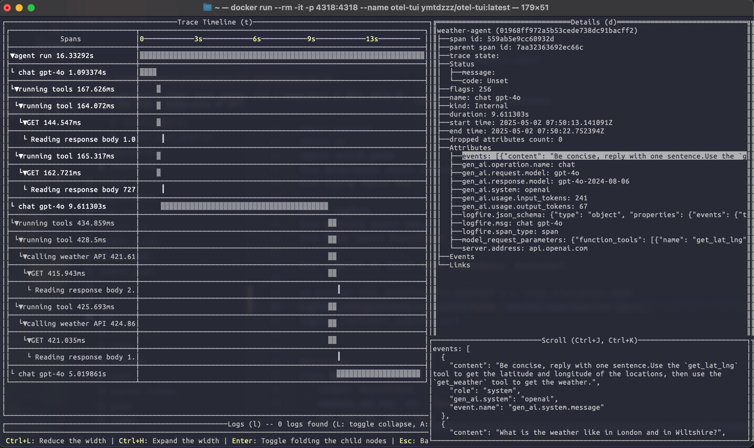 Running the weather agent example connected to otel-tui shows how it can be used to visualise a more complex trace: